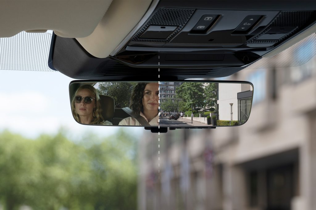 Switches between a traditional mirror and a real-time camera feed to improve rear visibility, especially in challenging conditions.